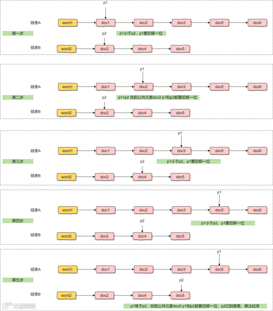 两者id相同则是公共元素,直接归并即可,然后P1 P2后移