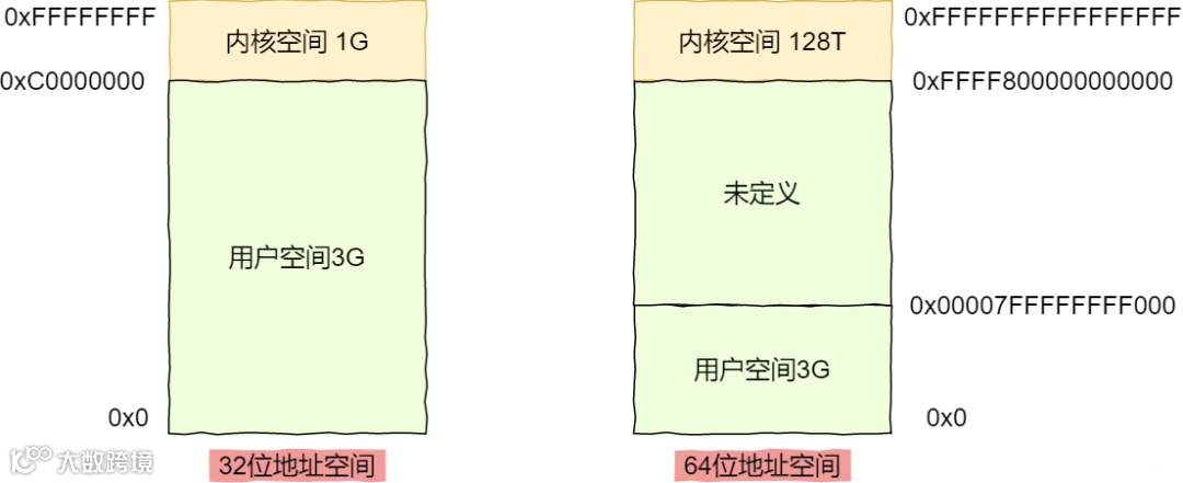 从这个图很明显的看出32位系统中内核空间1G,而64位的内核空间与用户空间都是128T。