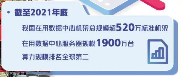 截至2021年底,我国在用数据中心机架总规模超过520万标准机架,平均上架率超过55%。在用数据中心服务器规模1900万台,存储容量达800艾字节。算力总规模超过140每秒浮点运算次数,近5年年均增速超过30%,算力规模排名全球第二。全国在用超大型、大型数据中心超过450个,智算中心超过20个。通用算力规模超过109每秒浮点运算次数,智能算力规模超过29每秒浮点运算次数。