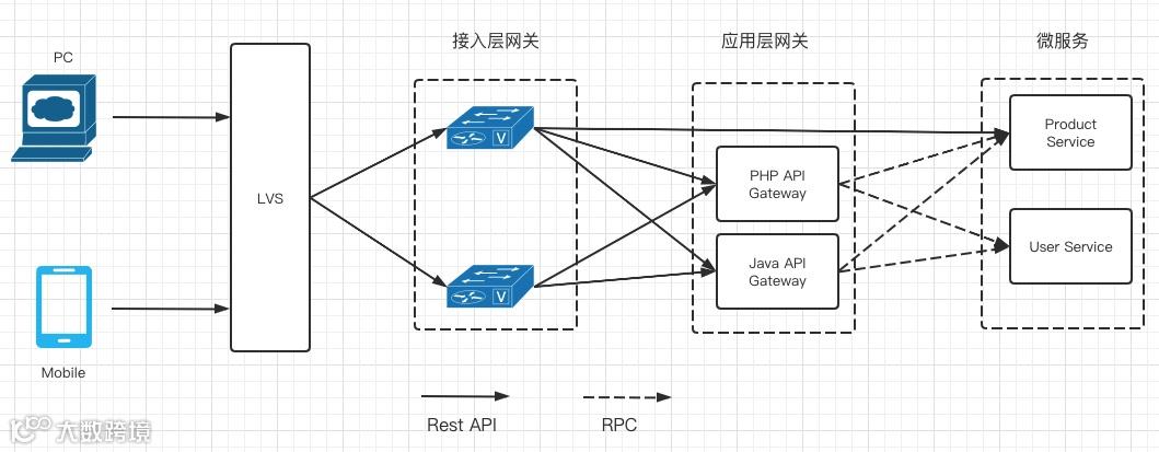 另一种是应用层网关,比如现在流行的微服务,各个服务可能是用不同的语言写的,如 PHP,Java 等,那么接入层就要将请求路由到相应的应用层集群,再由相应的应用层网关进行鉴权等处理,处理完之后再调用相应的微服务进行处理,应用层网关也起着路由,超时,重试,熔断等功能。