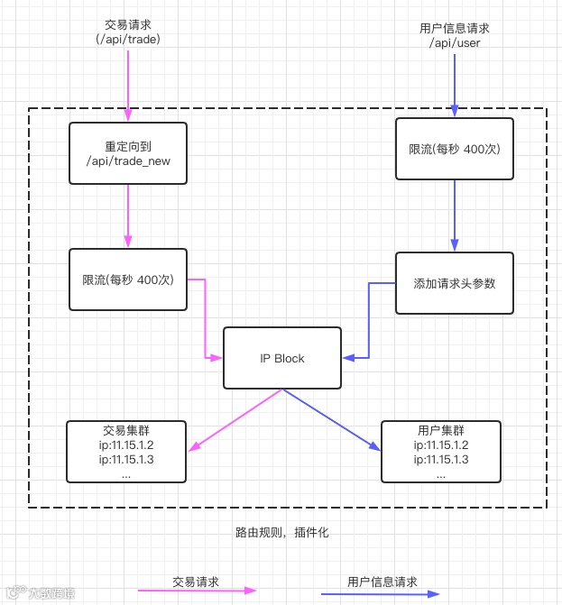 如图示,两个请求对应的路由规则是不一样的,它们对应的路由规则(限流,rewrite)等通过各个规则插件组合在一起,可以看到,光两个请求 url 的路由规则就有挺多的,如果一个系统大到一定程度,url 会有不少,就会有不少规则,这样每个请求的规则就必须「可配置化」,「动态化」,最好能在管理端集中控制,统一下发。