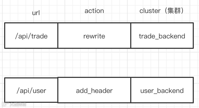 1、每条策略由 url ,action, cluster 等组成,代表请求 url 在打到后端集群过程中最终经历了哪些路由规则,这些规则统一在我们的路由管理平台配置,存在 db 里。