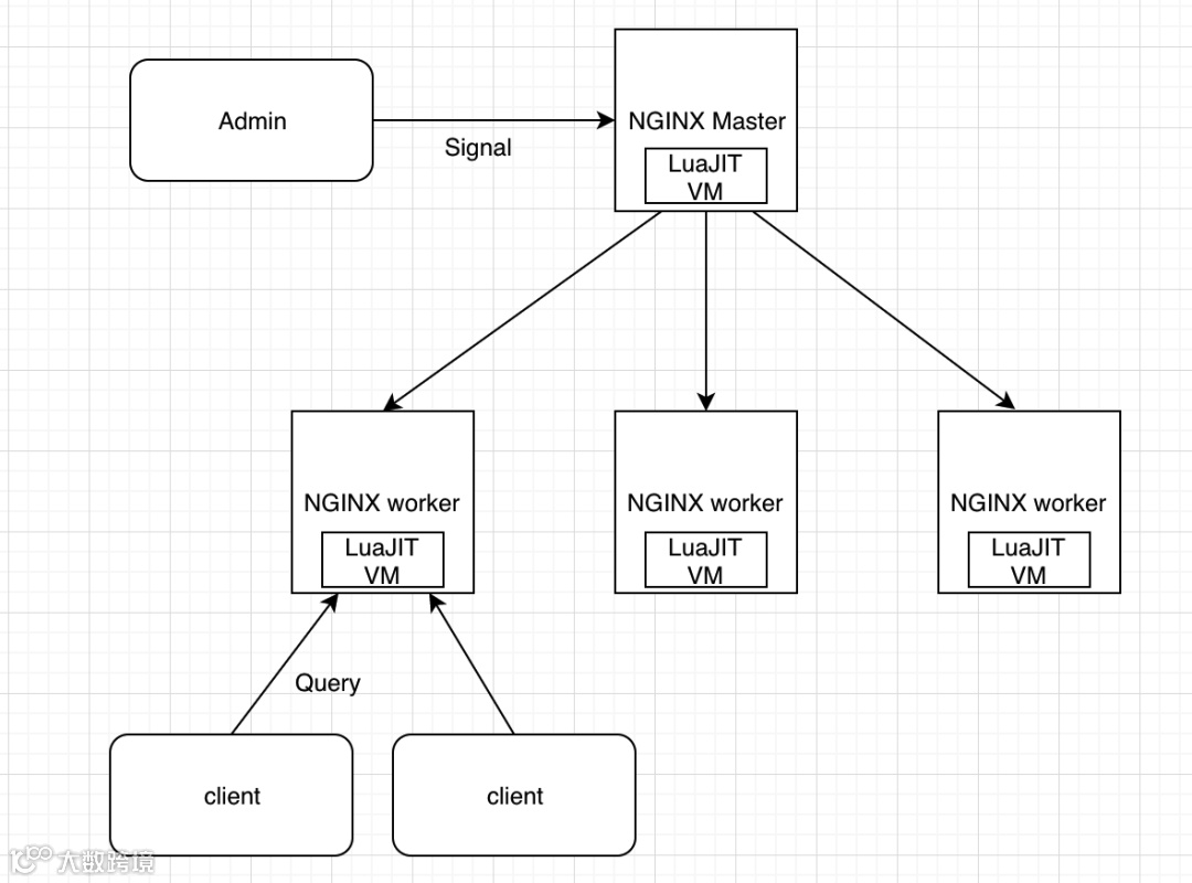 首先启动的 master 进程带有 LuaJIT 的机虚拟,而 worker 进程是从 master 进程 fork 出来的,在 worker 内进程的工作主要由 Lua 协程来完成,也就是说在同一个 worker 内的所有协程,都会共享这个 LuaJIT 虚拟机,每个 worker 进程里 lua 的执行也是在这个虚拟机中完成的。
