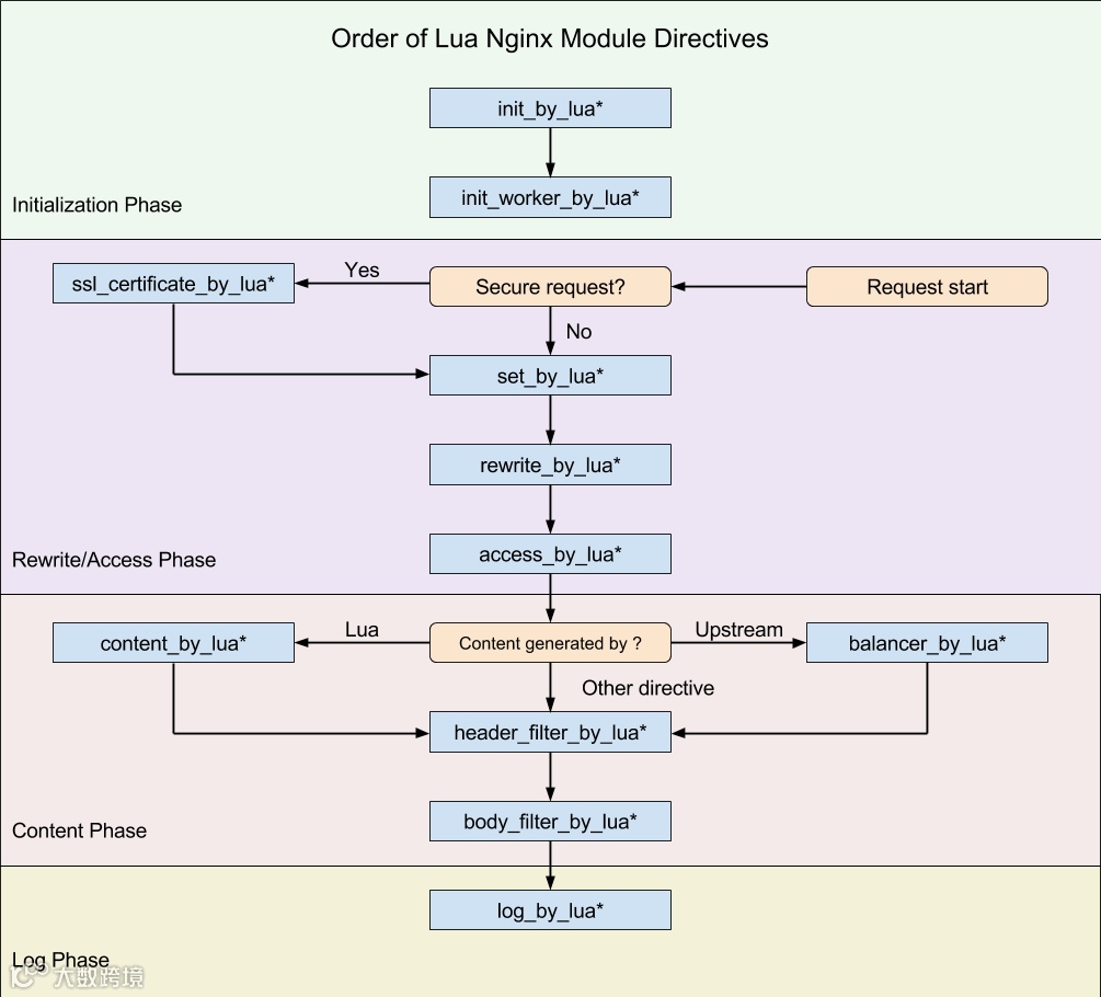 Nginx 的每个请求有 11 个阶段,OpenResty 也有11 个 *_by_lua 的指令,如下图示: