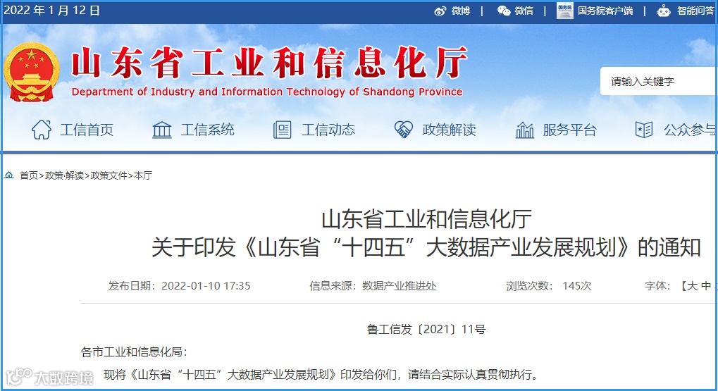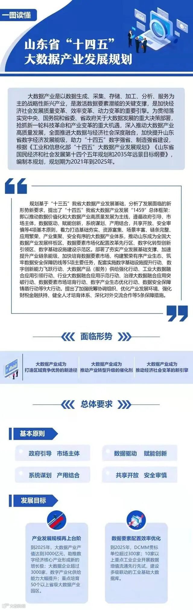 为抢抓新一轮科技革命和产业变革的重大机遇,深入推 动大数据产业高质量发展,全面推进大数据与经济社会深度融合, 加快提升山东省数字经济发展能级,助力“十四五”数字强省、 制造强省建设,山东出台《山东省“十四五”大数据产业发展规划》。