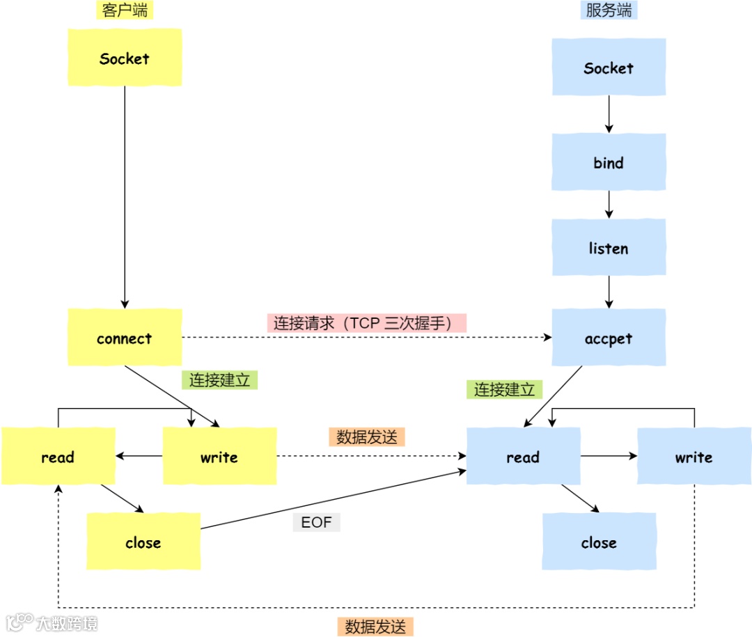 这里需要注意的是,服务端调用 accept 时,连接成功了会返回一个已完成连接的 socket,后续用来传输数据。