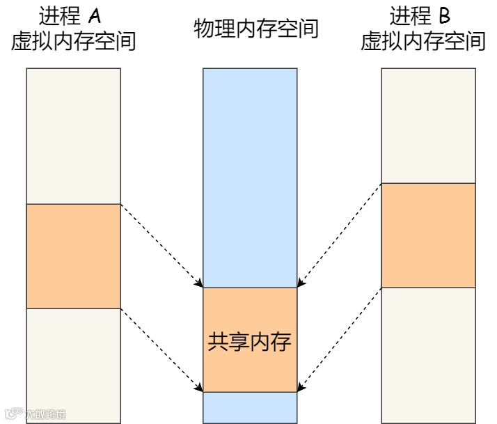共享内存的机制,就是拿出一块虚拟地址空间来,映射到相同的物理内存中。这样这个进程写入的东西,另外一个进程马上就能看到了,都不需要拷贝来拷贝去,传来传去,大大提高了进程间通信的速度。