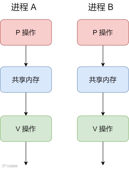 进程 A 在访问共享内存前,先执行了 P 操作,由于信号量的初始值为 1,故在进程 A 执行 P 操作后信号量变为 0,表示共享资源可用,于是进程 A 就可以访问共享内存。