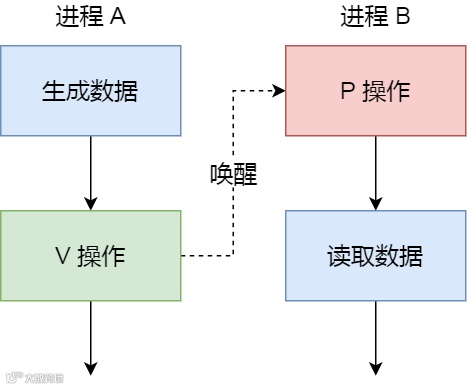 接着,当进程 A 生产完数据后,执行了 V 操作,就会使得信号量变为 0,于是就会唤醒阻塞在 P 操作的进程 B;