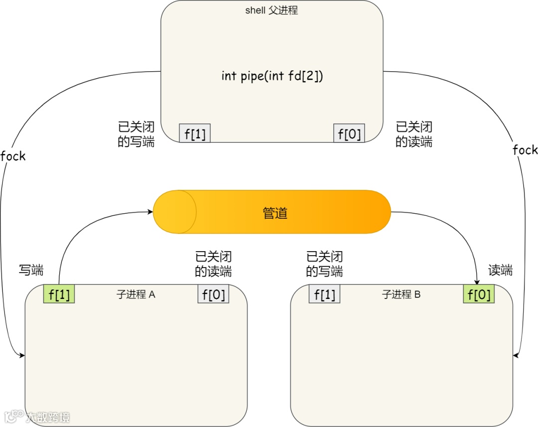在 shell 里面执行 A | B命令的时候,A 进程和 B 进程都是 shell 创建出来的子进程,A 和 B 之间不存在父子关系,它俩的父进程都是 shell。