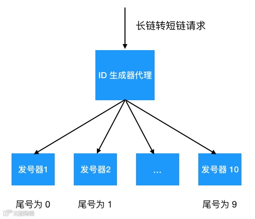 用 Redis 是个不错的选择,性能好,单机可支撑 10 w+ 请求,足以应付大部分的业务场景,但有人说如果一台机器扛不住呢,可以设置多台嘛,比如我布置 10 台机器,每台机器分别只生成尾号0,1,2,... 9 的 ID, 每次加 10 即可,只要设置一个 ID 生成器代理随机分配给发号器生成 ID 就行了。