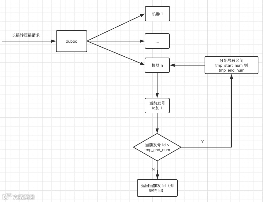 当长链转短链的请求打到某台机器时,先看这台机器是否分配了短链号段,未分配就往发号表插入一条记录,则这台机器将为短链分配范围在 tmp_start_num 到 tmp_end_num 之间的 id。从 tmp_start_num 开始分配,一直分配到 tmp_end_num,如果发号 id 达到了 tmp_end_num,说明这个区间段的 id 已经分配完了,则再往发号表插入一条记录就又获取了一个发号 id 区间。