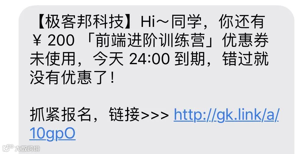来看下以下极客时间发我的营销短信,点击下方蓝色的链接(短链)