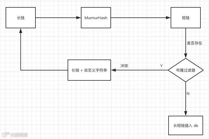 当长链经过 MurmurHash 得到短链后,直接将长短链对应关系插入 db 中,如果 db 里不含有此短链的记录,则插入,如果包含了,说明违反了唯一性索引,此时只要给长链再加上我们上文说的自定义字段「DUPLICATE」,重新 hash 再插入即可,看起来在违反唯一性索引的情况下是多执行了步骤,但我们要知道 MurmurHash 发生冲突的概率是非常低的,基本上不太可能发生,所以这种方案是可以接受的。