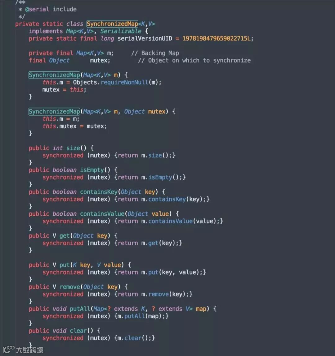 再来看看第二种方法,使用Collections.synchronizedMap方法,我们打开 JDK 源码,部分内容如下: