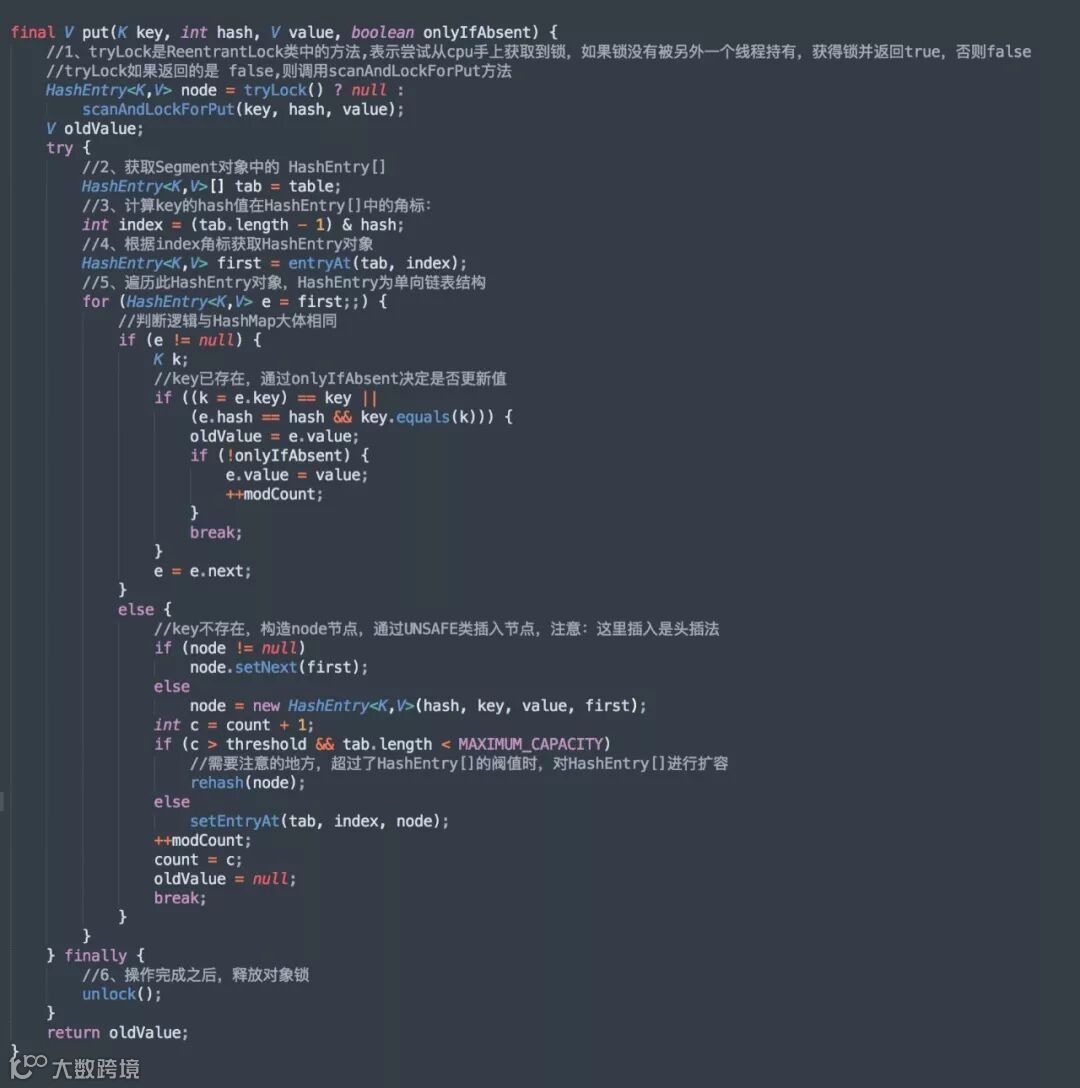 第二步,获取到锁之后,类似 hashMap 的 put 方法,通过 key 计算所在 HashEntry 数组的下标; -