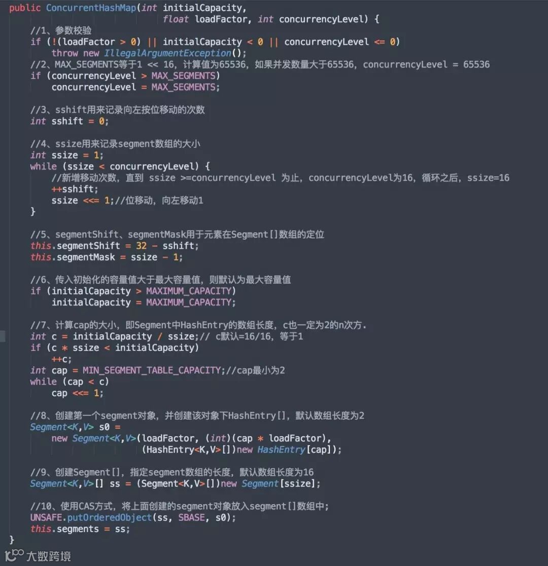 其中,值得注意的是 concurrentLevel 这个参数,虽然 Segment 数组大小 ssize 是由 concurrentLevel 来决定的,但是却不一定等于 concurrentLevel,ssize 通过位移动运算,一定是大于或者等于 concurrentLevel 的最小的 2 的次幂!