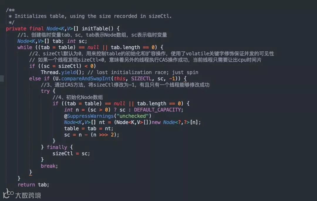 sizeCtl 是一个对象属性,使用了 volatile 关键字修饰保证并发的可见性,默认为 0,当第一次执行 put 操作时,通过Unsafe.compareAndSwapInt()方法,俗称CAS,将 sizeCtl修改为 -1,有且只有一个线程能够修改成功,接着执行 table 初始化任务。