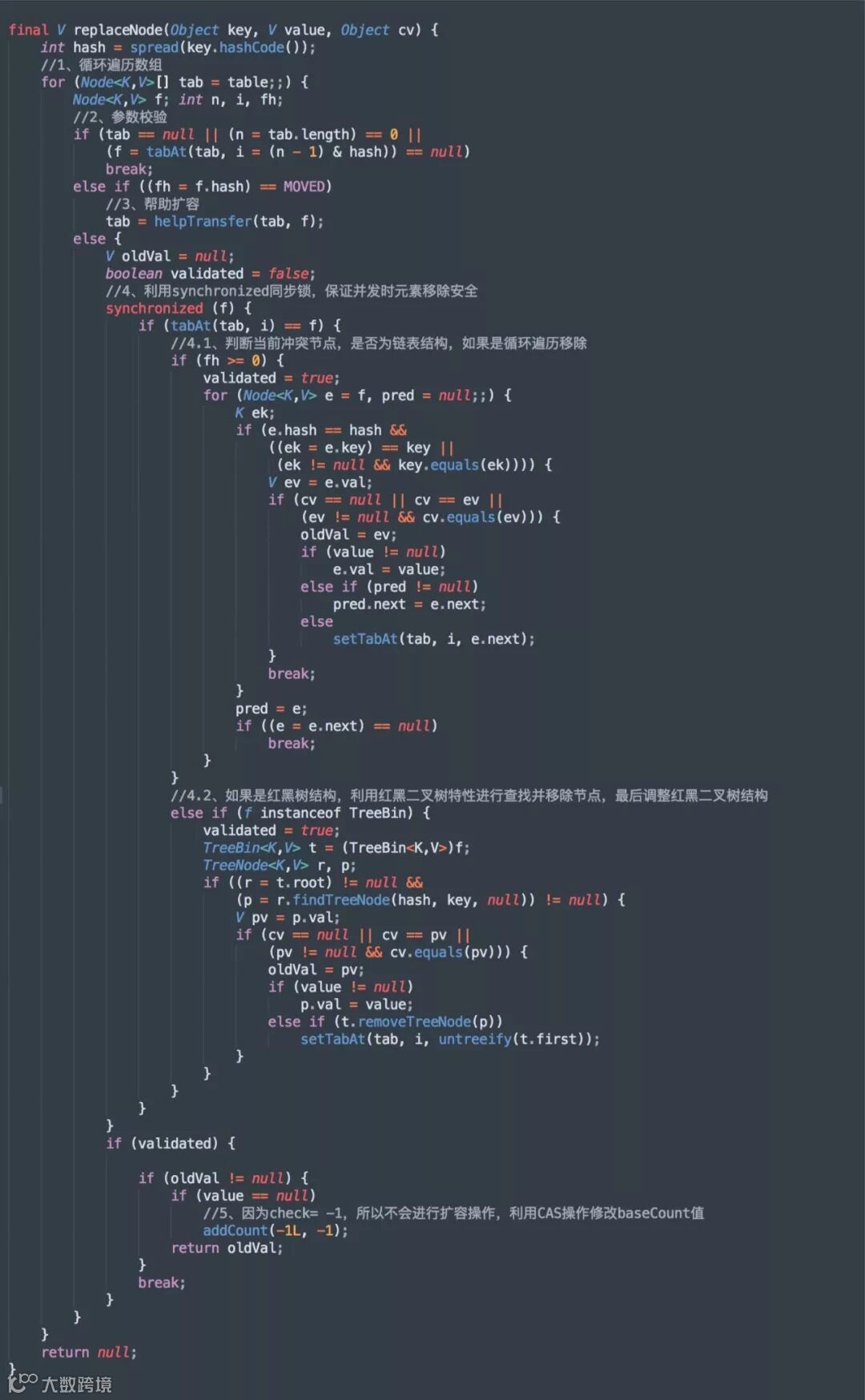 先获取对象锁,如果获取到之后执行移除操作,之后的操作类似 hashMap 的移除方法,步骤如下: