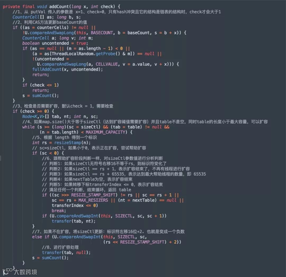 我们再来看看源码中的第 9 步 addCount()方法,插入完成之后,扩容判断,源码如下: