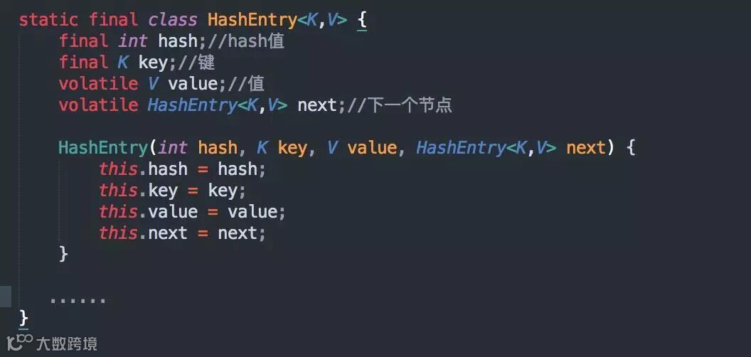 HashEntry和HashMap中的 Entry非常类似,唯一的区别就是其中的核心数据如value ,以及next都使用了volatile关键字修饰,保证了多线程环境下数据获取时的可见性!