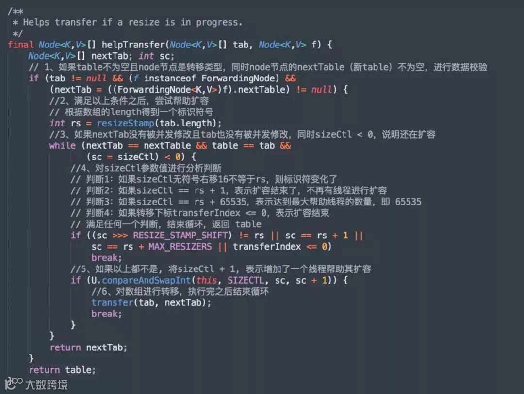我们继续来看看 put 方法中第 5 步helpTransfer()方法,如果f.hash == -1成立,说明当前f是ForwardingNode节点,意味有其它线程正在扩容,则一起进行扩容操作,源码如下: