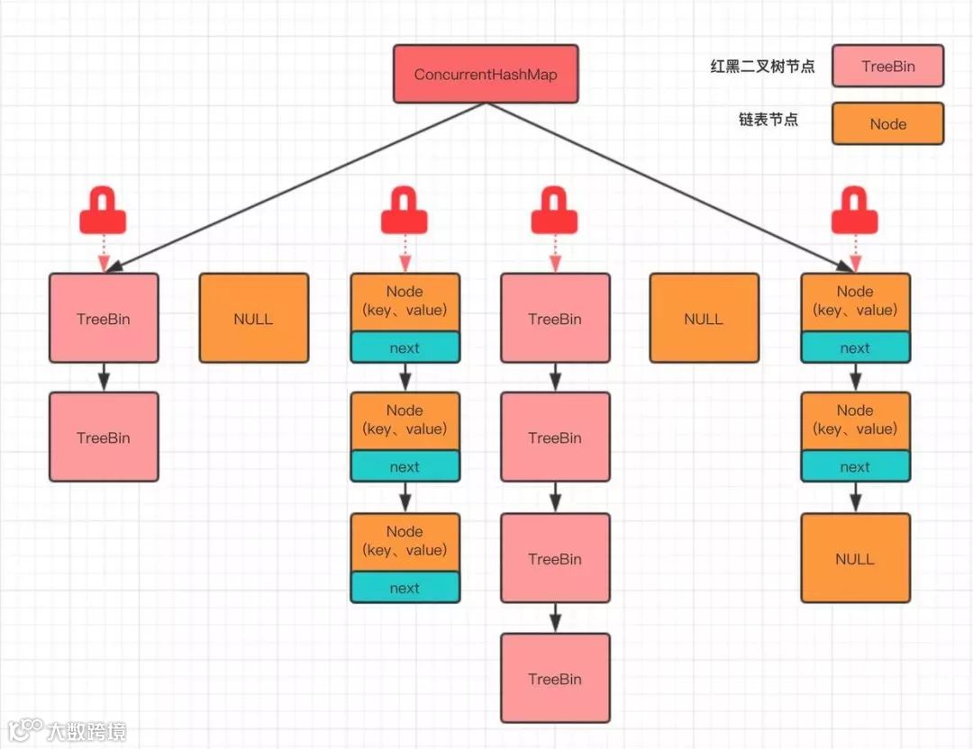 JDK1.8 对 HashMap 做了改造,当冲突链表长度大于 8 时,会将链表转变成红黑树结构,上图是 ConcurrentHashMap 的整体结构,参考 JDK1.7!
