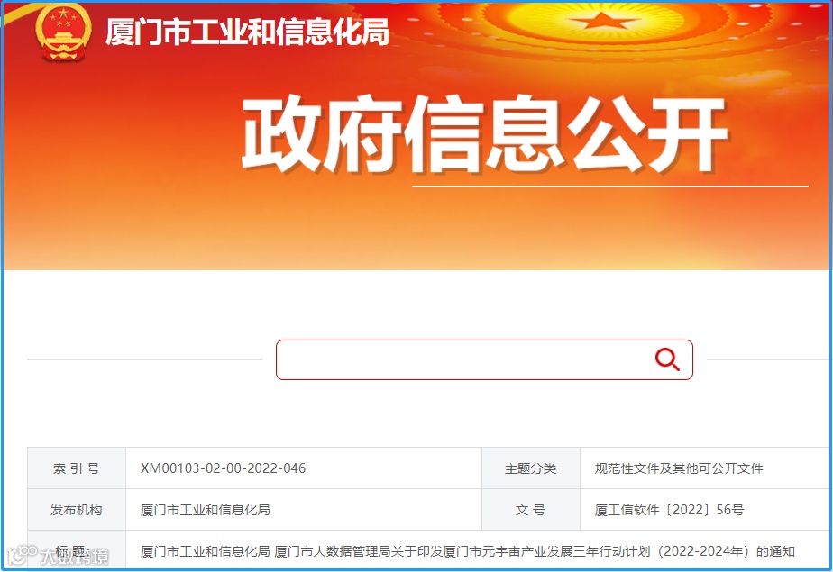 3月30日,链向科技从厦门市工业和信息化局网站获悉,为抢抓数字经济和元宇宙发展新机遇,近日,厦门市工业和信息化局、厦门市大数据管理局联合发布《厦门市元宇宙产业发展三年行动计划(2022-2024年)》(以下简称《行动计划》),力争到2024年,厦门的元宇宙产业生态初具雏形,引入培育一批掌握关键技术、营收上亿元的元宇宙企业,元宇宙技术研发和应用推广取得明显进展,对政府治理、民生服务、产业转型升级的带动作用进一步增强。