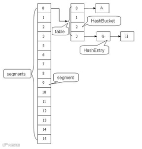 一个ConcurrentHashMap里包含一个Segment数组,Segment的结构和HashMap类似,是一种数组和链表结构, 一个Segment里包含一个HashEntry数组,每个HashEntry是一个链表结构的元素, 每个Segment守护者一个HashEntry数组里的元素,当对HashEntry数组的数据进行修改时,必须首先获得它对应的Segment锁。