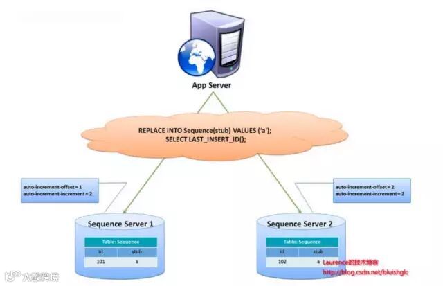 另有一种主键生成策略,类似sequence表方案,更好的解决了单点和性能瓶颈问题。这一方案的整体思想是:建立2个以上的全局ID生成的服务器,每个服务器上只部署一个数据库,每个库有一张sequence表用于记录当前全局ID。表中增长的步长是库的数量,起始值依次错开,这样就能将ID的生成散列到各个数据库上