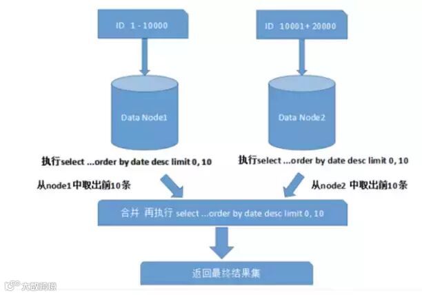上图只是取第一页的数据,对性能影响还不是很大。但是如果取得页数很大,情况就变得复杂的多,因为各分片节点中的数据可能是随机的,为了排序的准确性,需要将所有节点的前N页数据都排序好做合并,最后再进行整体排序,这样的操作很耗费CPU和内存资源,所以页数越大,系统性能就会越差。