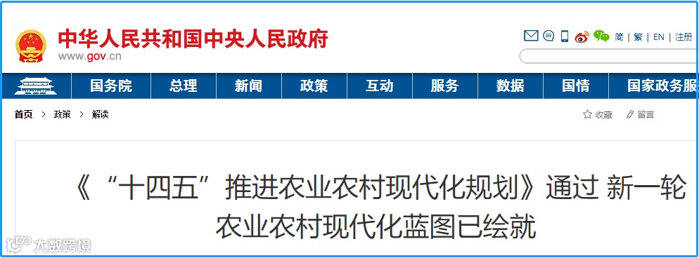 12月14日,链向科技从国务院网站获悉,近日,国务院印发了《“十四五”推进农业农村现代化规划》(以下简称《规划》),提出了未来五年农业农村现代化建设的思路目标和重点任务。《规划》提出了科学推进乡村规划、加强乡村基础设施建设、整治提升农村人居环境、加快数字乡村建设、提升农村基本公共服务水平、扩大农村消费等任务。