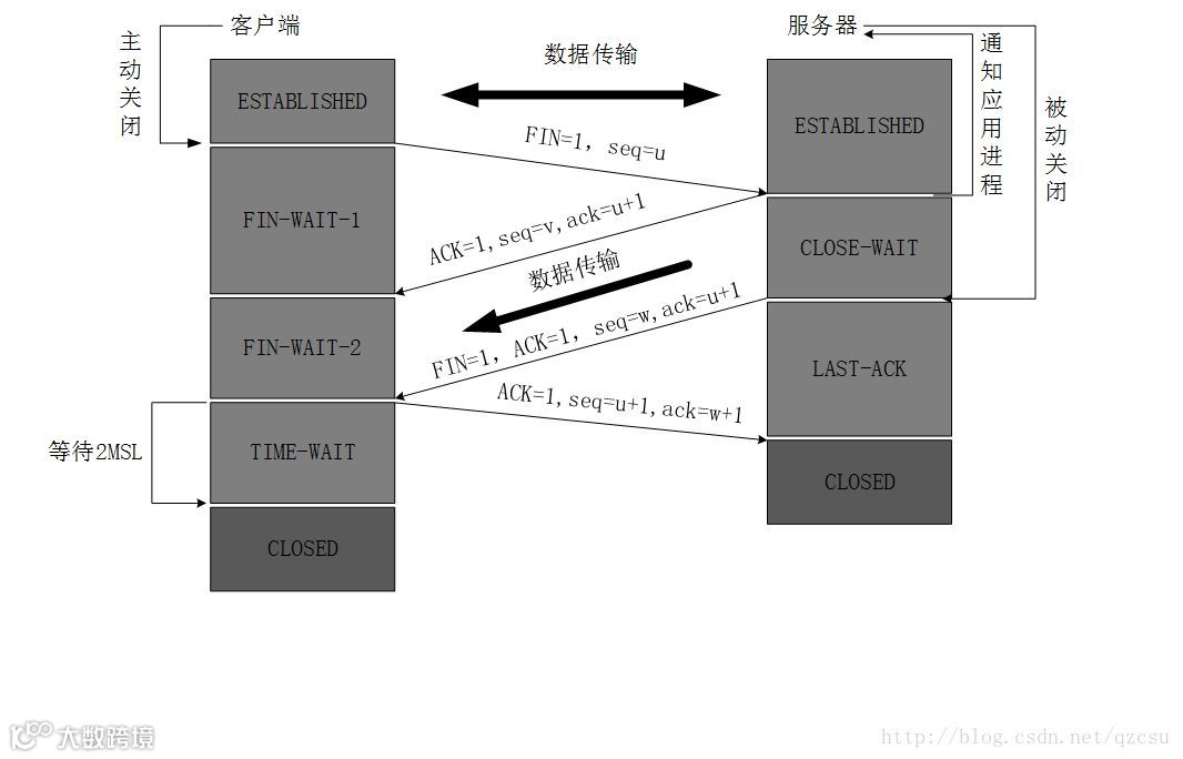 数据传输完毕后,双方都可释放连接。最开始的时候,客户端和服务器都是处于ESTABLISHED状态,然后客户端主动关闭,服务器被动关闭。