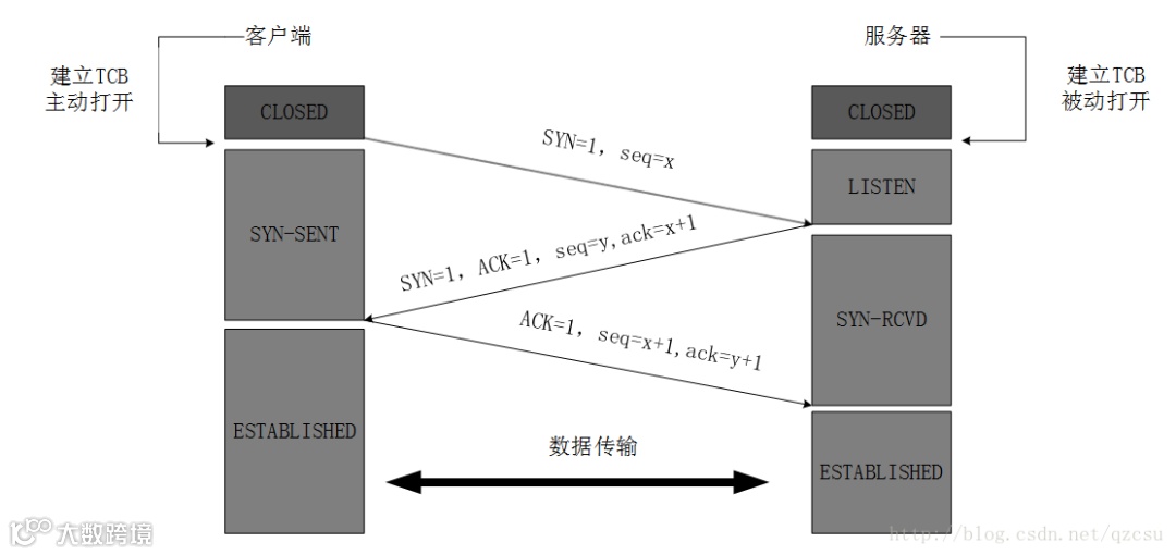 最开始的时候客户端和服务器都是处于CLOSED状态。主动打开连接的为客户端,被动打开连接的是服务器。