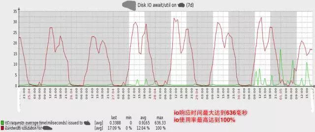 下图是数据库主库的压力, 可见磁盘IO使用率已经非常高,高峰期IO响应时间最大达到636毫秒,IO使用率最高达到100%。