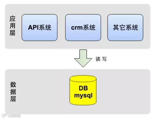 作为创业公司,最重要的一点是敏捷,快速实现产品,对外提供服务,于是我们选择了公有云服务,保证快速实施和可扩展性,节省了自建机房等时间。在技术选型上,为快速的响应业务需求,业务系统使用Python做为开发语言,数据库使用MySQL。如下图所示,应用层的几大系统都访问一个数据库。