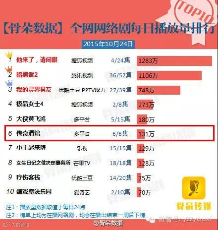 随着网剧《传奇酒馆》第六集上映,37《传奇霸业》定制真人版网剧迎来大结局。据了解,截止至10月25日,《传奇酒馆》全网播放量达3000万并屡次登上国内专业的网络剧数据分析营销平台——骨朵网络剧每日播放量与累计播放总量排行榜。在播放量不断攀升的趋势下,《传奇酒馆》已然成为社交网络中一部当红“爆款”网剧,成功的背后得益于大胆创新的话题互动以及成功有效的跨界合作。