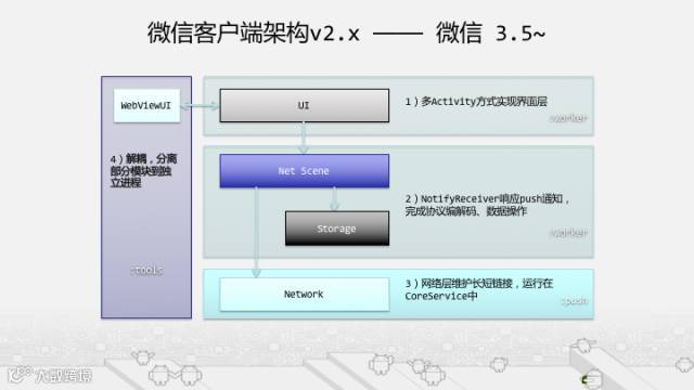 对比v1.x版本的微信客户端架构图,我们将右下角Network的部分用轻重进程分离的思想,独立到一个单独的进程(:push)中,而上面两个层级依然跑在微信的主进程(:worker)中。而对于有内存泄露问题的webview或者其他不频繁使用的功能,再把其分离到独立的工具进程(:tools)中。通过分离进程,微信第一次重构解决了系统因为微信资源消耗,主动干掉微信服务的困境。