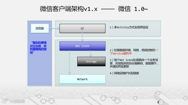 这种设计思路不是微信首创,现在回顾也并不复杂。如果你的产品历史功能不多,迭代不是很快,可以全部人停下来1到2个月集中一次重构搞定。但对于微信来说,但这一版的架构变更,更像是在给天上飞着的飞机换发动机,由一支10来个人组成的团队完成。互联网的快速、敏捷给处在“创业”阶段的我们新的挑战。如何做到呢?要保证不给处于高度需求压力下的开发人员增加架构变动的额外负担,首先要做的就是不要让他们重复修改代码,无缝迁移到新的架构。