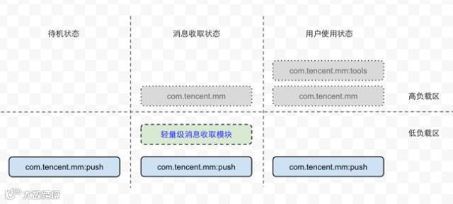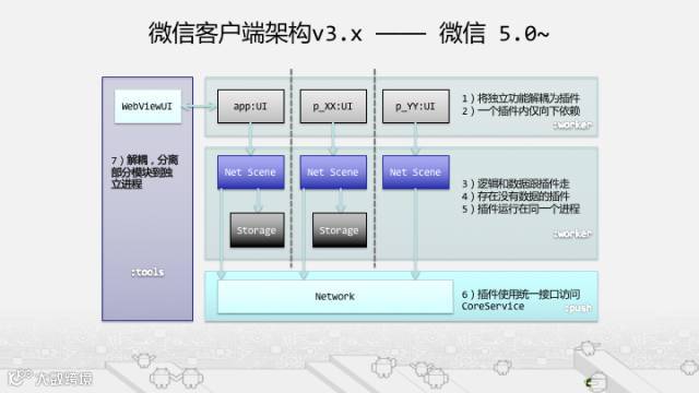 微信在高速发展过程当中,到5.0的时候已经有很多功能,而其中一些功能,随着用户群体、产品设计等因素变化,用户使用的频率在改变。之前试错的一些功能,也大量存留在微信版本中。这些不常使用的功能不应该始终占用程序资源,从架构上进行纵向分离,保证主要场景的体验,是这一时期的主要设计思路。