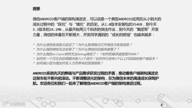 很快,微信的架构演进进入了第三个阶段(v3.x)。微信4.5版本的开发过程中,出现了无法安装在一部分Android 2.3以下系统的机器上,当时2.3的市占率还在50%以上。试想一下,市场上一半用户的手机不能安装使用微信,这对我们是一个致命打击。放在今天看,2.3早已被淘汰,但在当时,我们不可能停下来等待,无论从开发和产品来说都是不可接受的。技术分析的直接原因就是,微信的发展速度太快,触发到Android虚拟机机制的设计缺陷。
