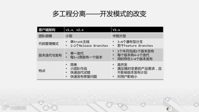 不同的客户端架构时期,背后的团队和开发模式也会有所不同。对比三个版本的客户端架构,v1.x和v2.x的时候比较适合小型团队、没有特别复杂或者反复需求的客户端进行快速开发。单trunk主线开发即可满足。每次发布后,拉出来一个对应的release branch,如果发现有bug或者小优化需要修改,直接在这个release branch上修改、测试、发布上线。这一时期release branch通常保持在两个以内,当前版本和前一版本。当前版本是为了线上问题的快速发布,而前版本则是为了修复一些厂商渠道预装的问题。