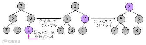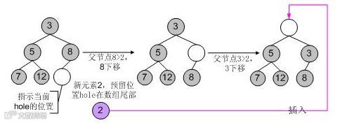 举个例子,向一个小根堆3, 5, 8, 7, 12中插入新元素2,使用第一中典型的代码逻辑,其调整过程如下图所示: