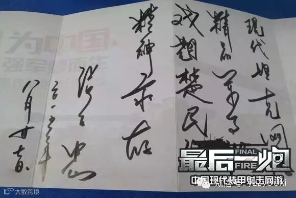 在游戏制作团队向张将军赠送书法横幅“张将军我爱你”后,张召忠将军也不甘示弱,为《最后一炮》题字:“现代坦克网游精品!军事游戏翘楚,民族精神永存!”,表示9.11测试节点选得很好,游戏策划团队够强势!