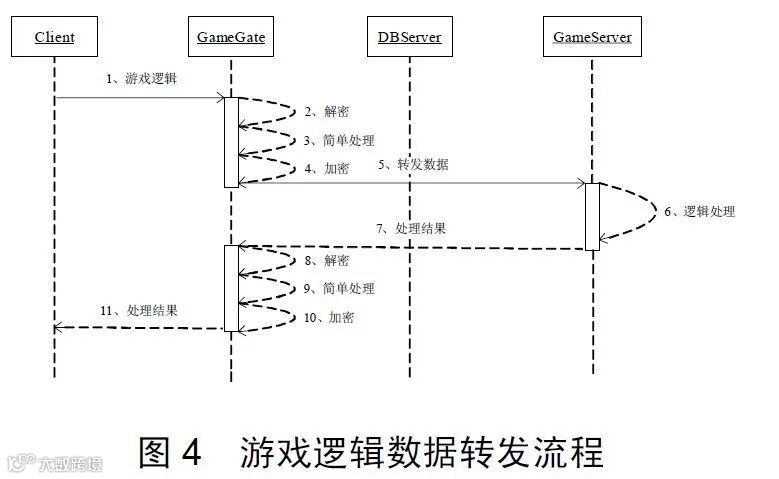 图4的流程说明了,在玩家游戏过程,客户端把逻辑协议(包括走、说话、跑、使用技能等)发给GG,GG完成加解密和简单逻辑处理之后转发给GS,GS负责这些协议的主要