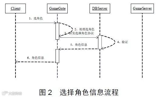 图2的流程说明了,在选角色过程中,客户端会把携带游戏账号和SessionKey的选角色协议发给GG,GG做一些简单处理之后转发给DBServer,DBServer要验证SessionKey的合法性,验证通过之后,DBServer会从角色信息缓冲区里取出该账户的所有角色信息发给客户端。这个过程在客户端的表现是,当选择好服务器组之后,客户端会直接显示该账号下的所有角色,之后就可以选择角色进入游戏了。
