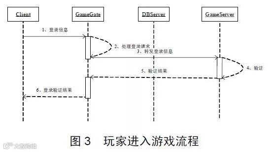 图3的流程说明了,在玩家选角色正式进入游戏时,客户端会把携带游戏账号、角色ID和SessionKey的登录协议发给GG,GG做一些简单处理之后转发给GS。GS会验证SessionKey的合法性,验证通过之后,GS会把验证通过的结果发给客户端,同时GS给DBServer发获取角色数据的协议,这些角色数据是一个玩家所有的游戏数据,包括装备、技能等等。