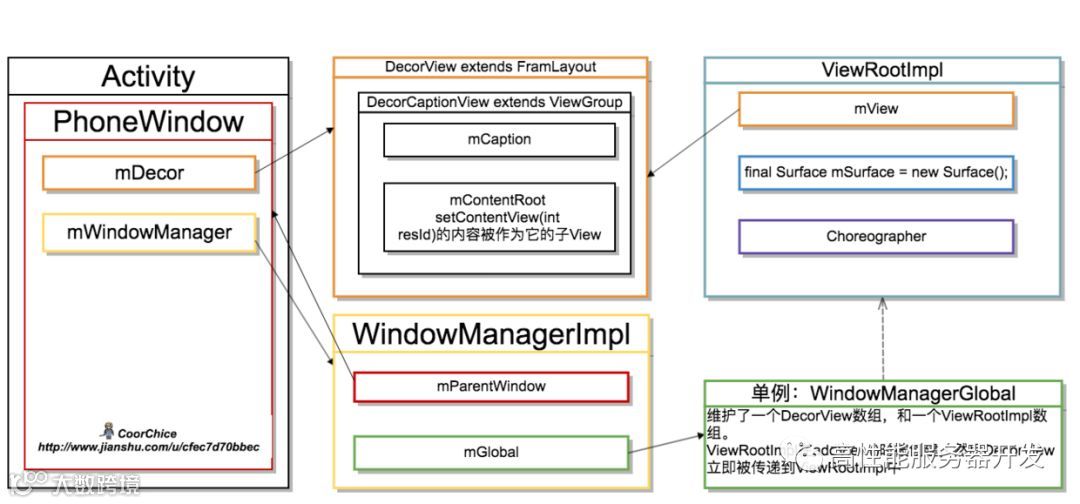 ViewRootImpl并不是一个View,而是负责管理视图的。它配合系统来完成对一个Window内的视图树的管理。从图中也可以看到,它持有了DecorView的引用,并且视图树它是视图树绘制的起点。因此,ViewRootImpl会稍微复杂一点,需要我们更深入的去了解,在图中我标出了它比较重要的组成Surface和Choreographer等都会在后面提到。