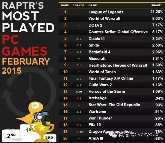 在外媒发布3月份PC游戏排名中,《英雄联盟》凭借21.26%的占有率稳居榜首,而《魔兽世界》占据榜单次席。值得注意的是,暴雪旗下4款产品均进入本月排名TOP20行列。除魔兽之外,《暗黑3》上涨2位暂居第5,而《炉石传说》和新入榜的《风暴英雄》分列第9和第13位。