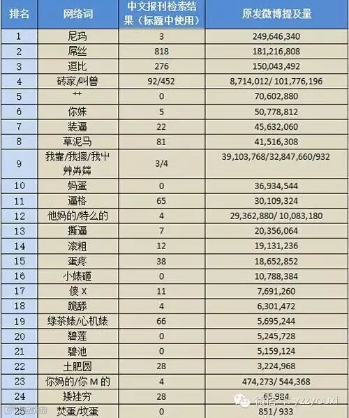 在2014年网络低俗语言排行中,“尼玛”、“屌丝”“逗比”“砖家/叫兽”“你妹”等榜上有名。